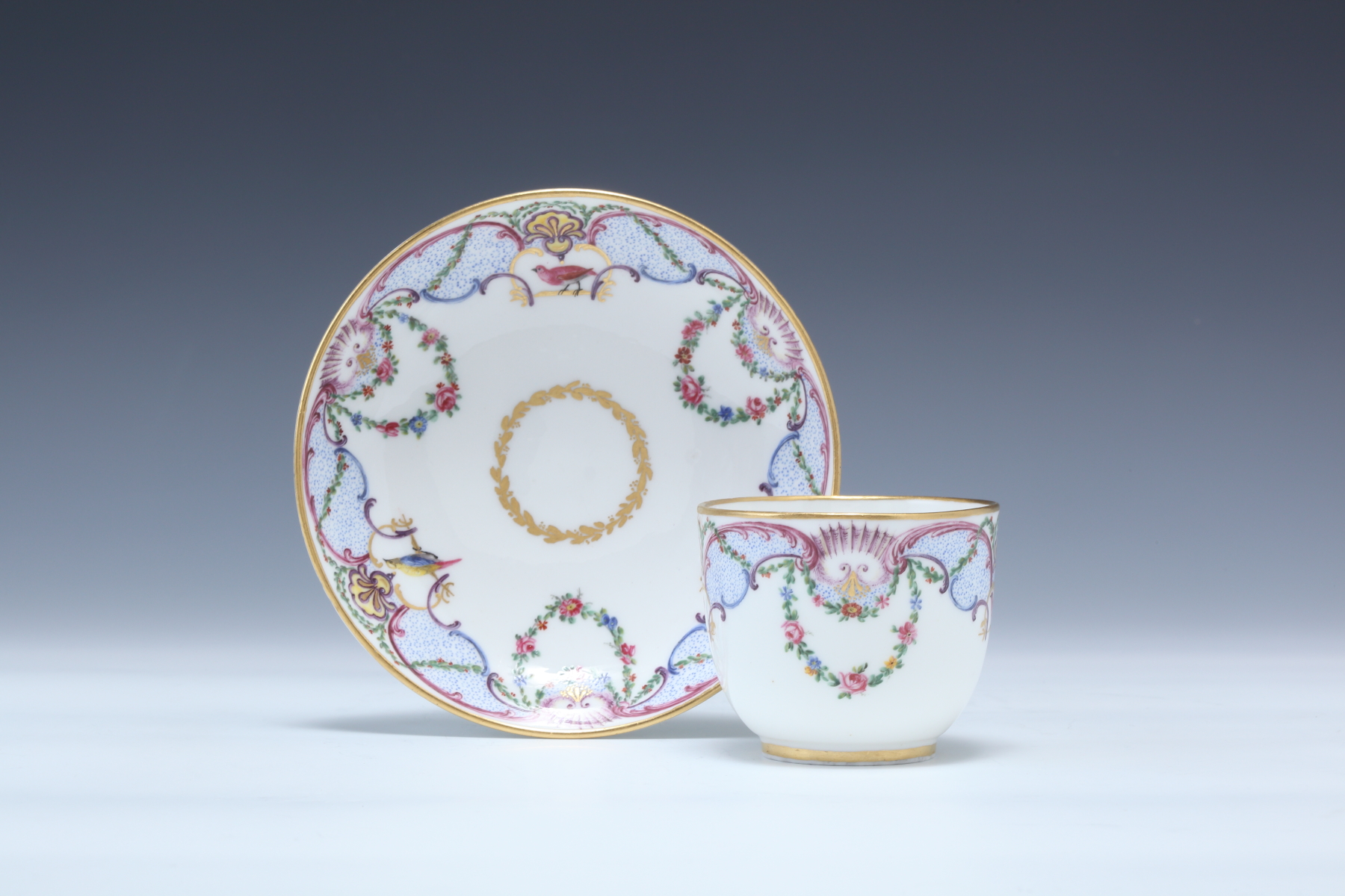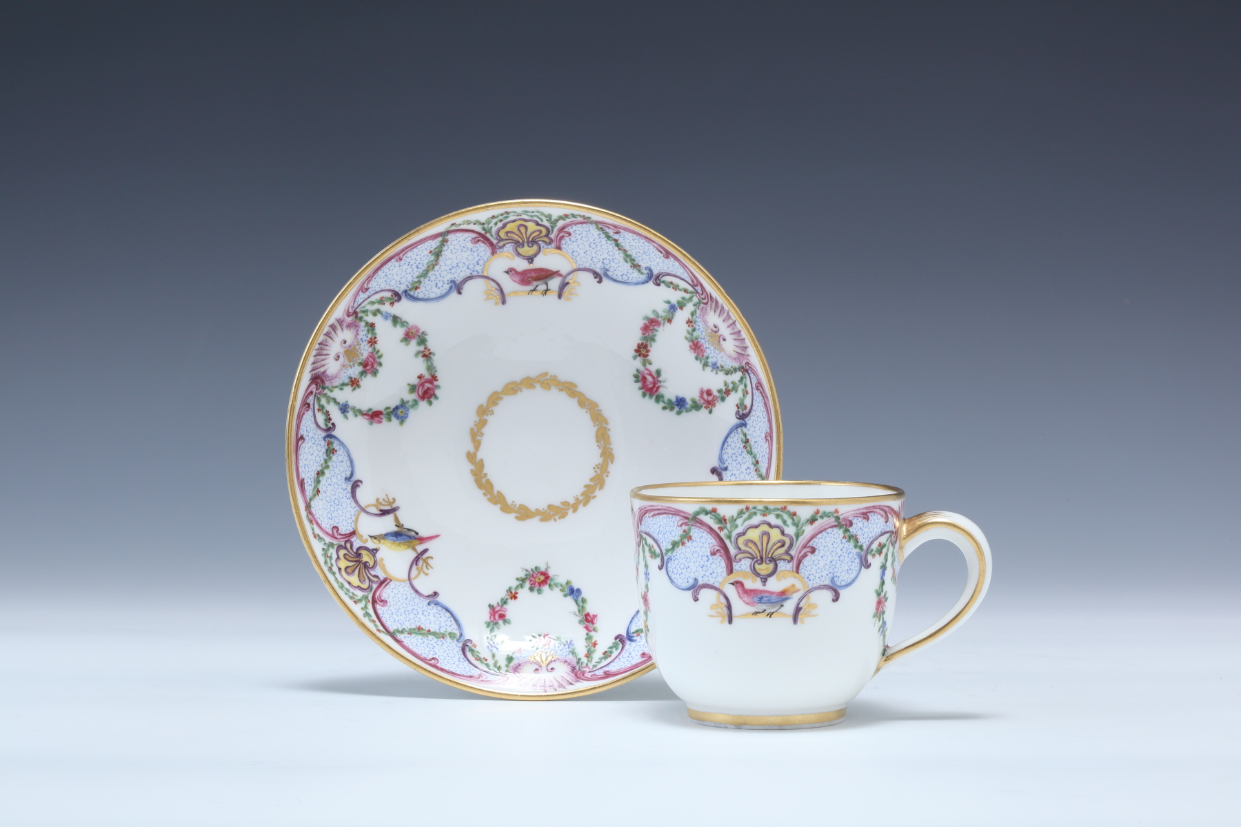エンジシェルとトレイルブルードットボーダー 花のガーランドと鳥絵カップ&ソーサー