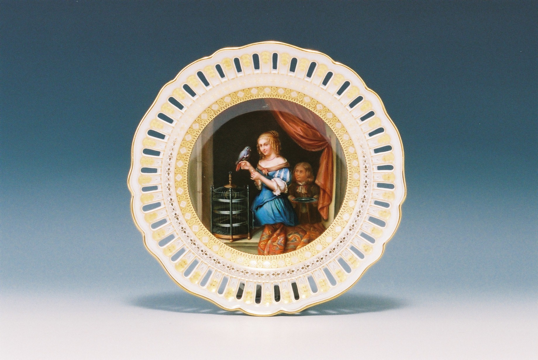 ルリ地金彩透かし彫りボーダー 名画図 飾皿額