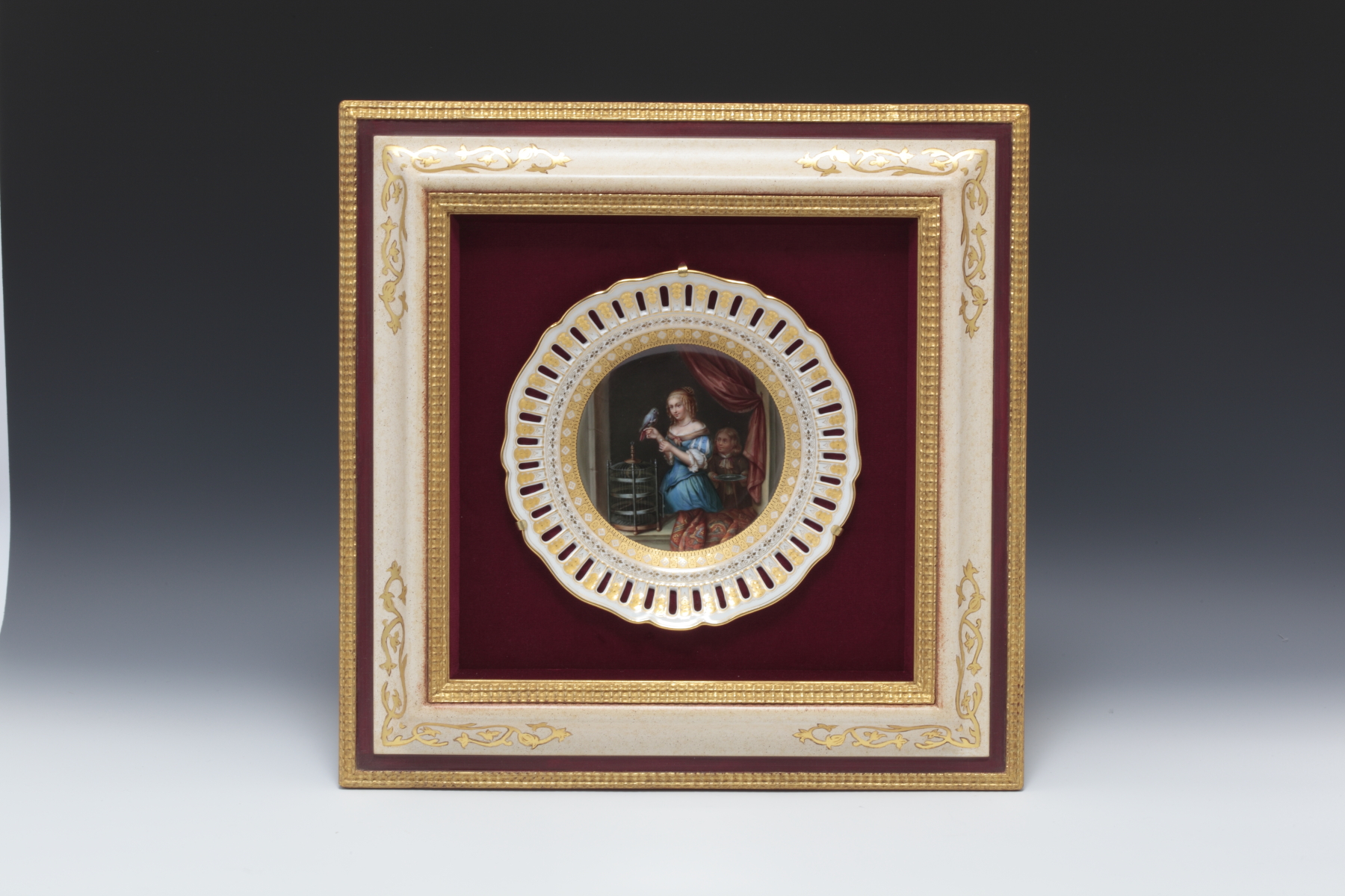 ルリ地金彩透かし彫りボーダー キャンドルの男性とマーブルバスト図飾皿額