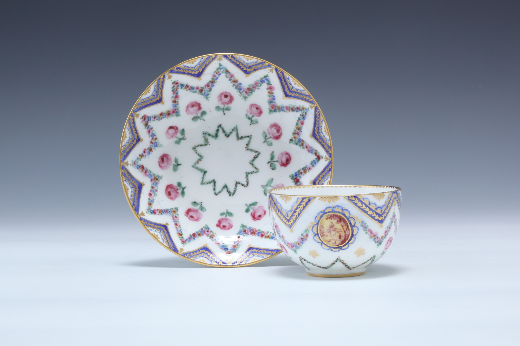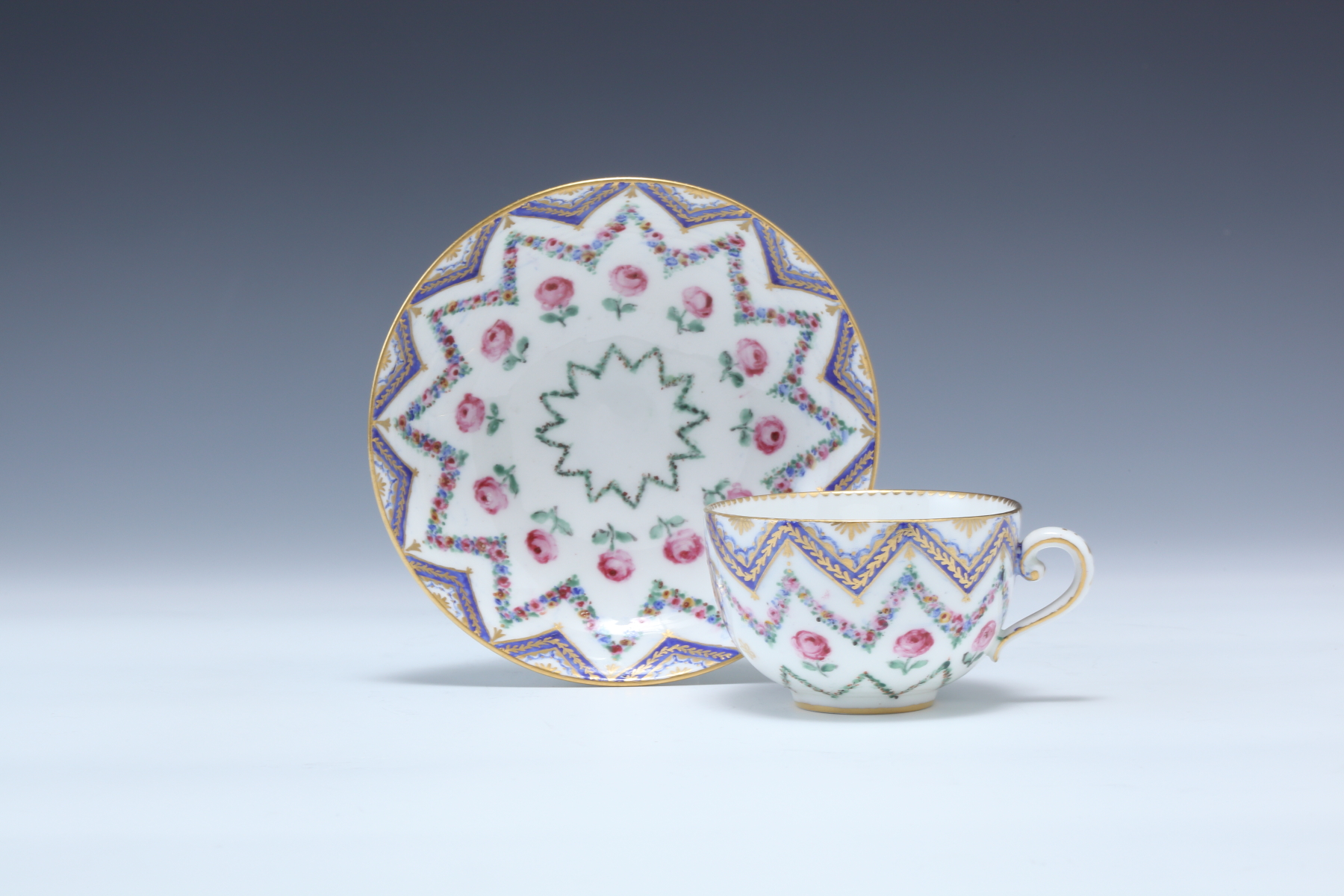 金とブルーのロカイユ地 ピンクバラ リトロンカップ&ソーサー(第4サイズ)
