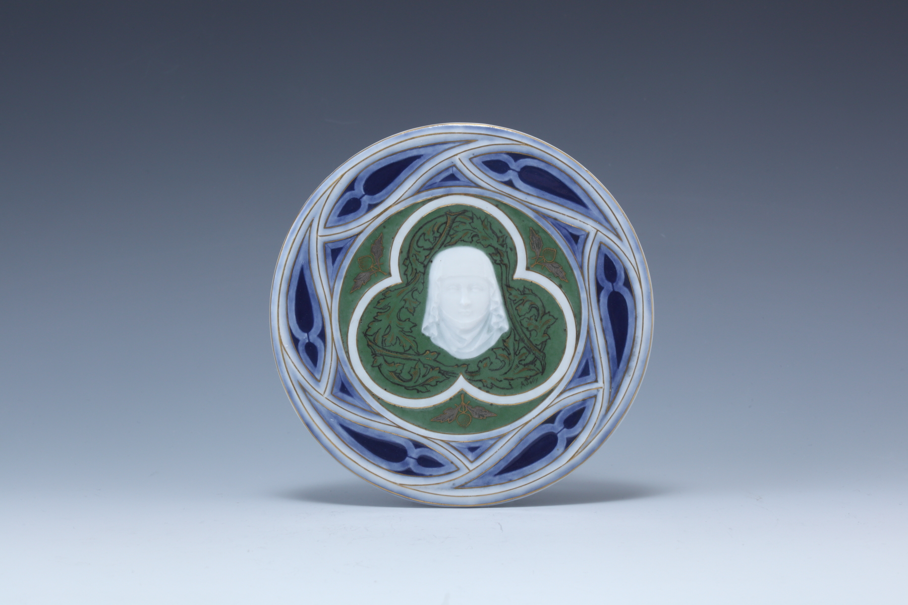 ルリ地金彩透かし彫りボーダー キャンドルの男性とマーブルバスト図飾皿額