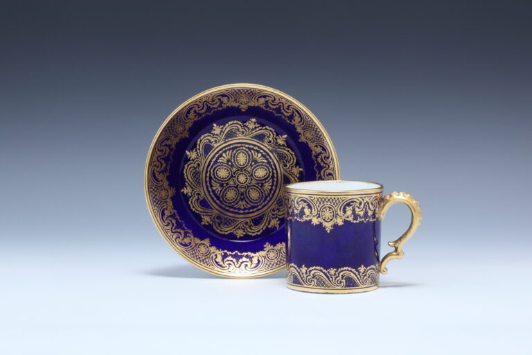 金とブルー地ヴァインリーフ文ハイループカップ&ソーサー