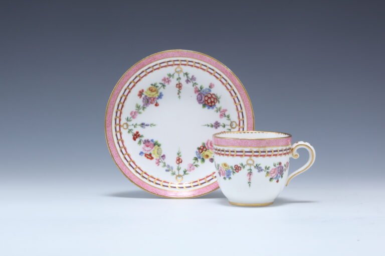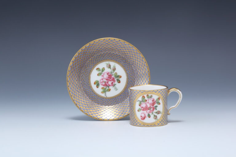 金とブルーのロカイユ地 ピンクバラ リトロンカップ&ソーサー(第4サイズ)