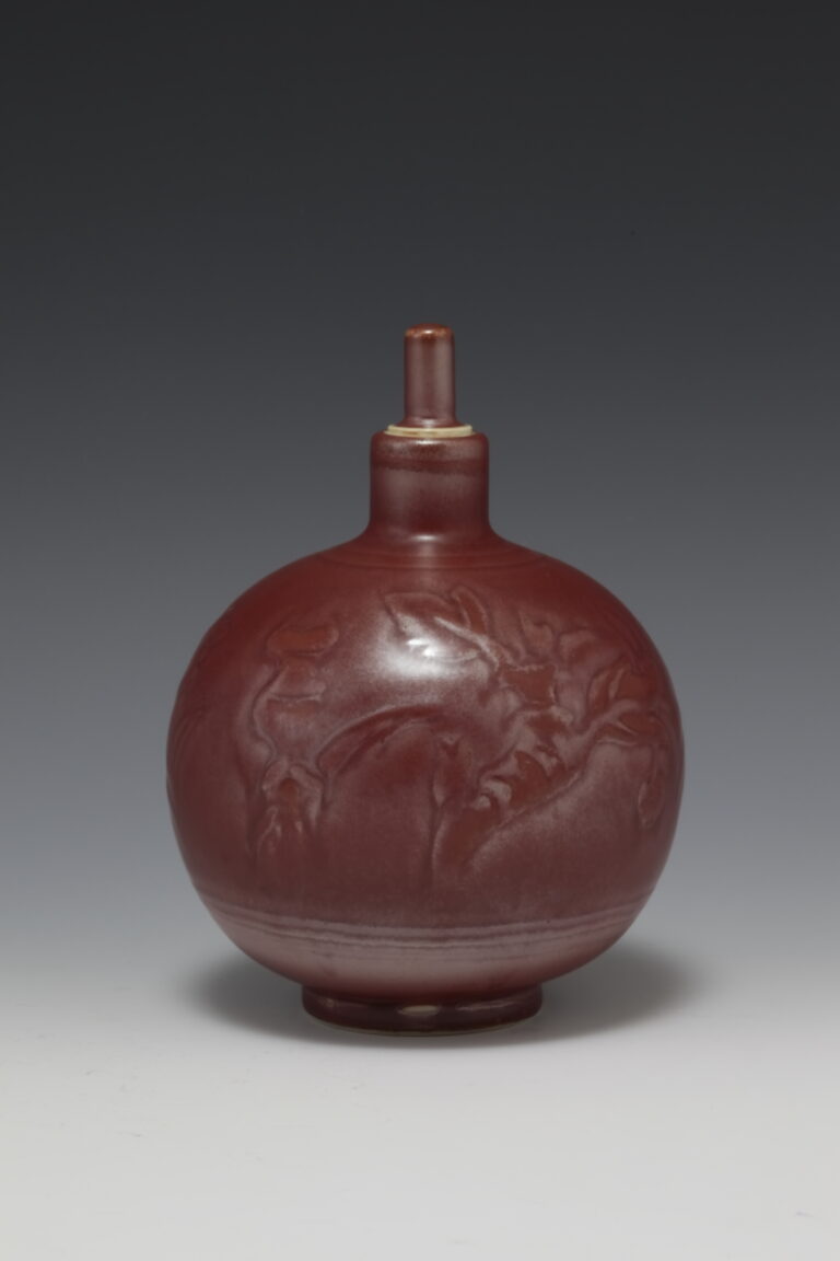赤茶色釉 浮彫り枝に果実文 蓋付シェイプボトル