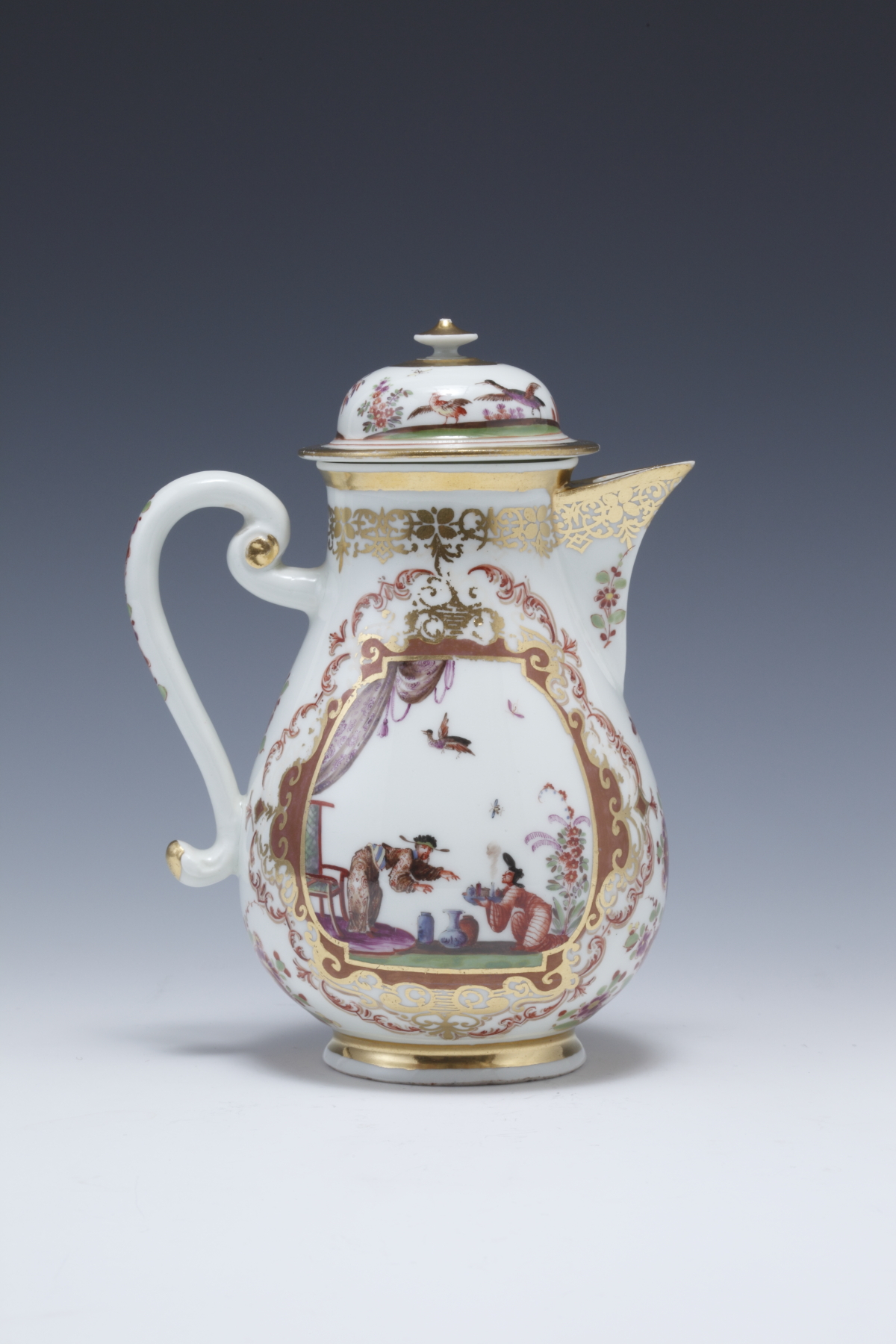 ヘロルドラスターカルトゥーシュ(窓絵)シノワズリー人物図 コーヒーポットふた付