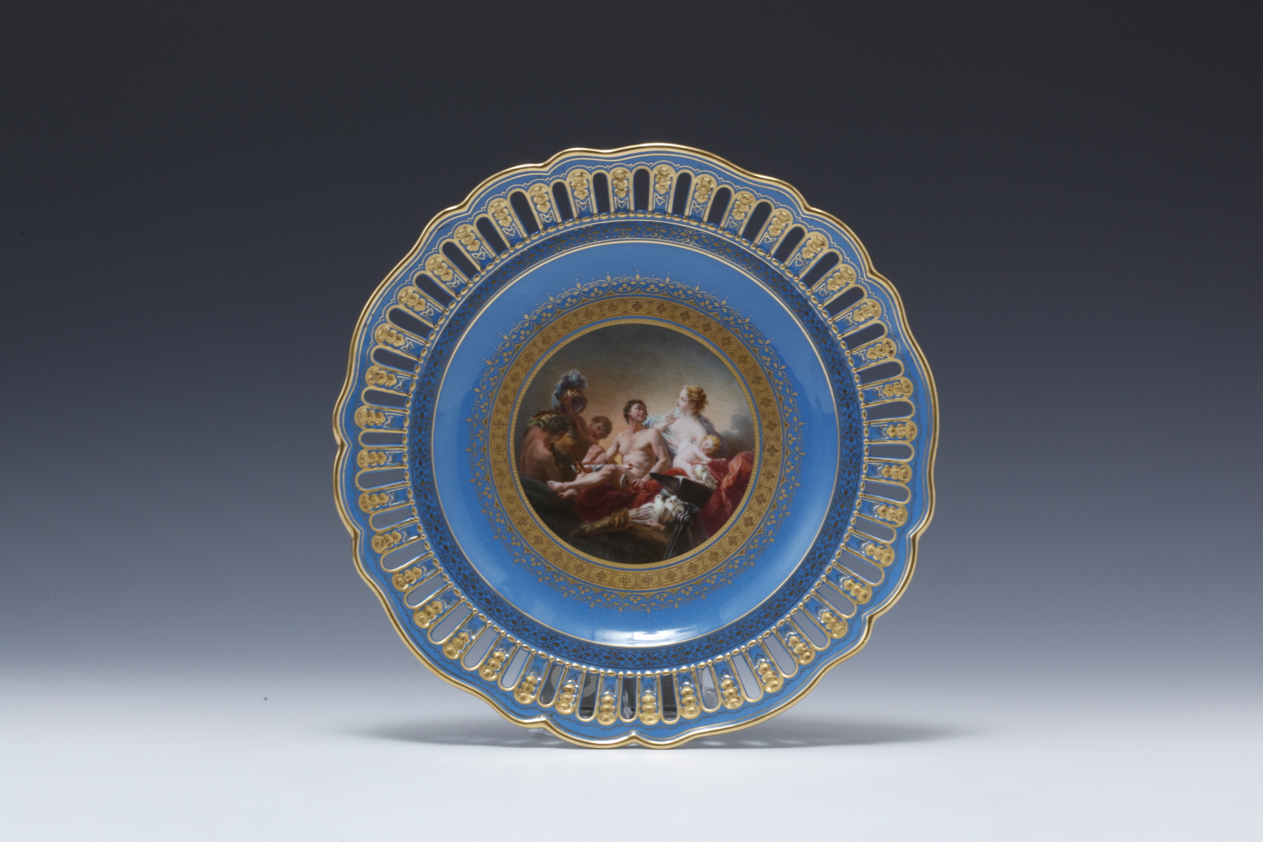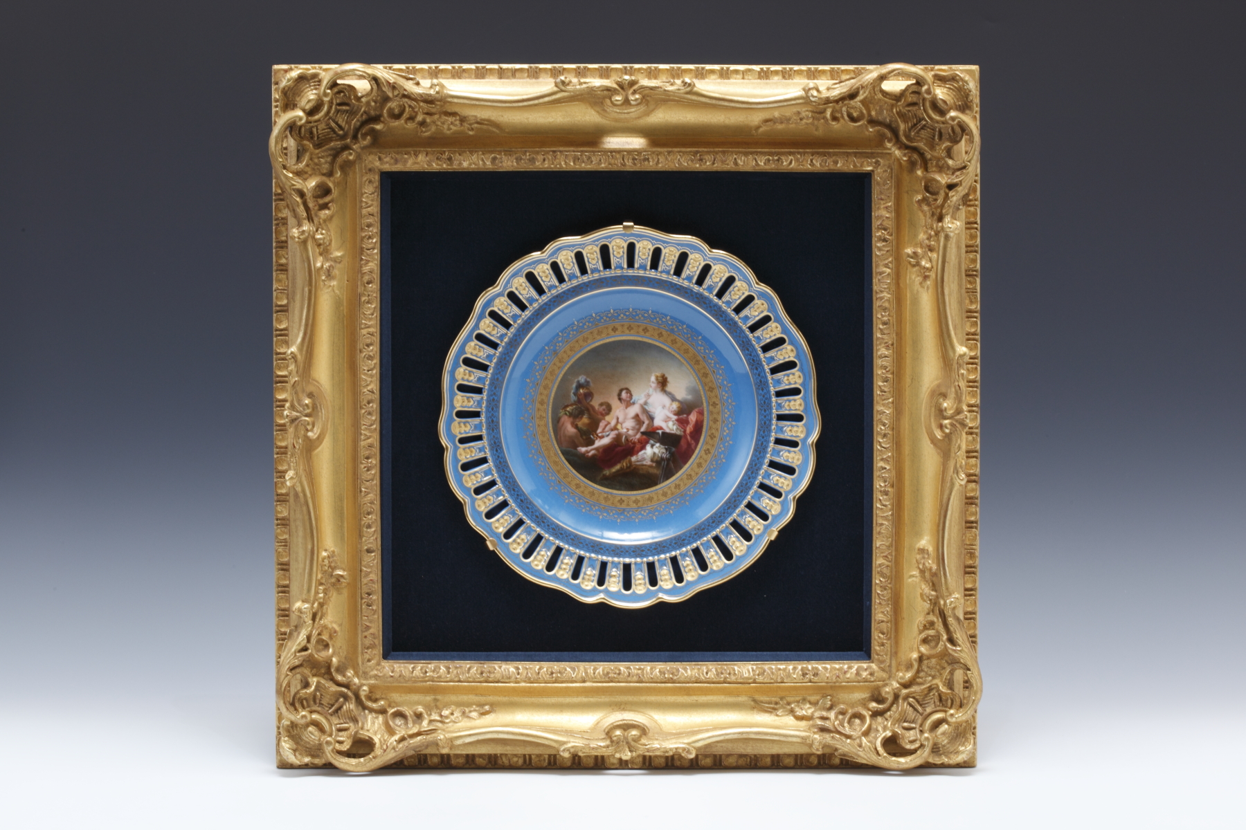 ルリ地金彩透かし彫りボーダー 名画図 飾皿額