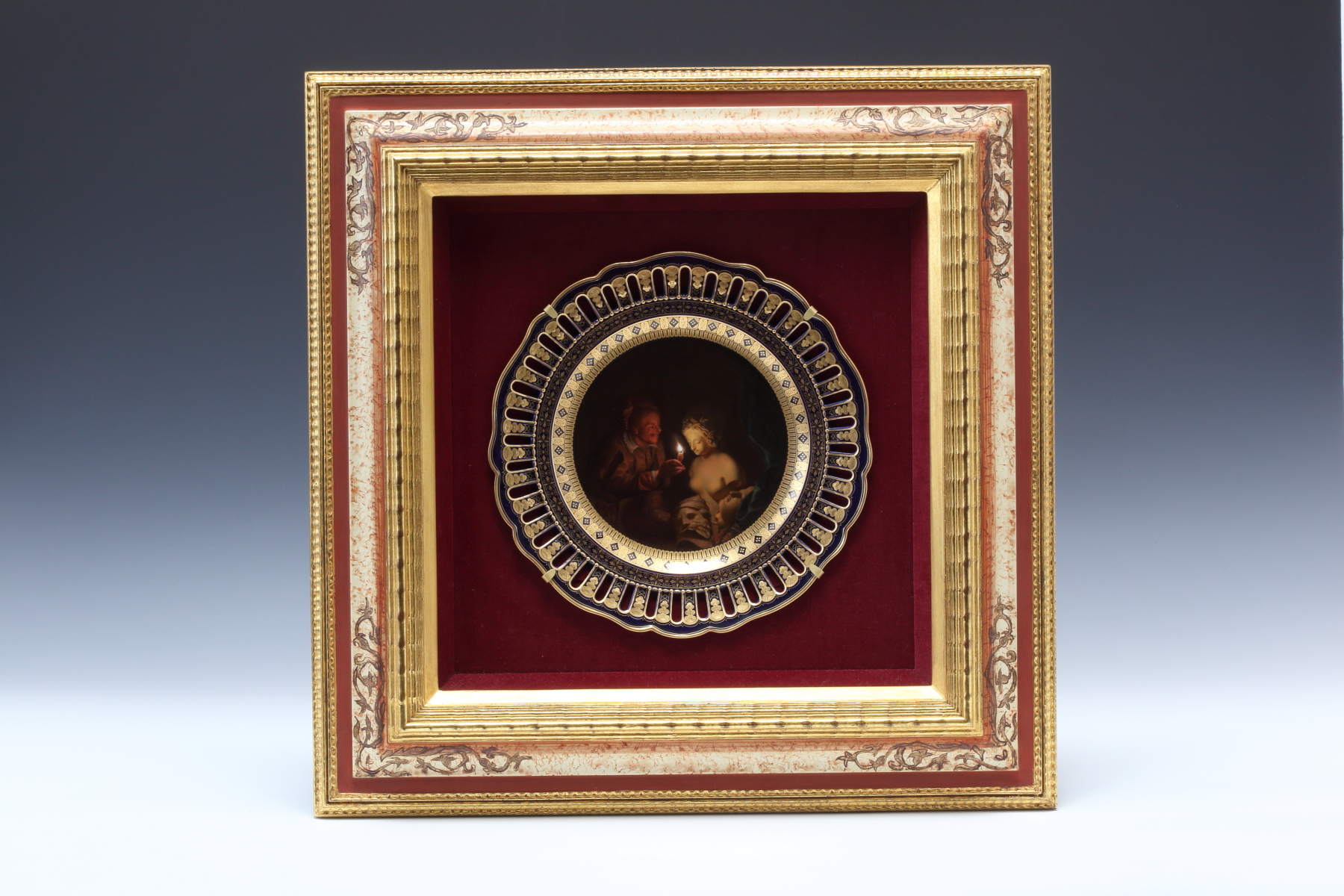 ルリ地金彩透かし彫りボーダー キャンドルの男性とマーブルバスト図飾皿額