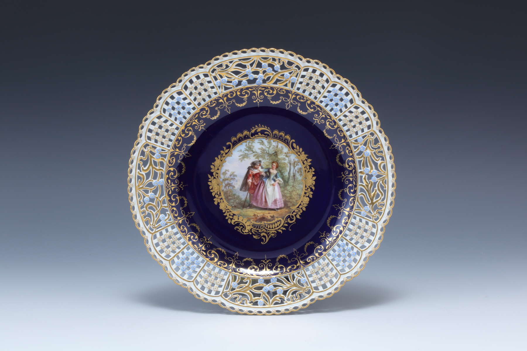 忘れな草透かし彫りボーダー ワトー風恋人図飾皿額