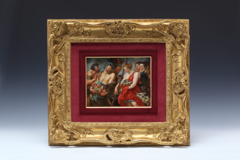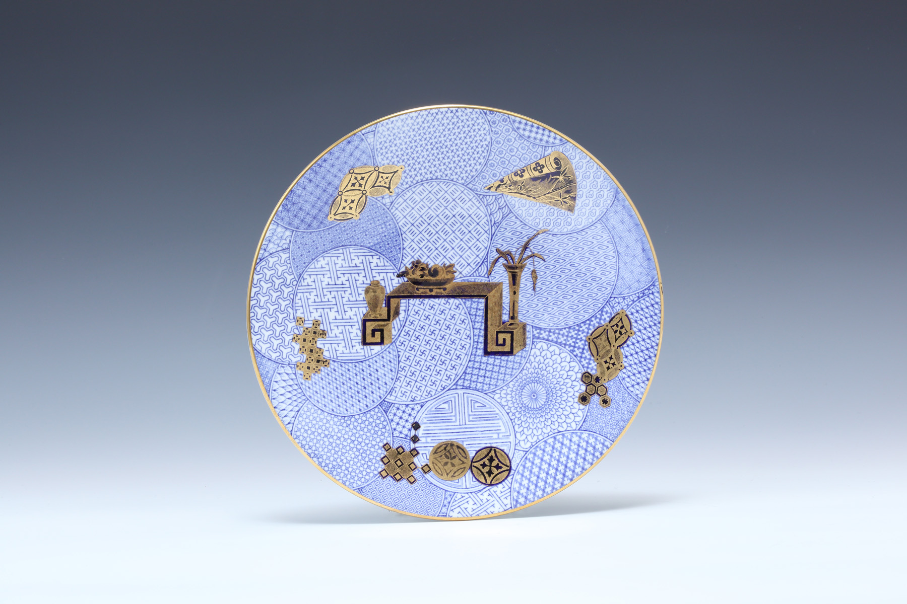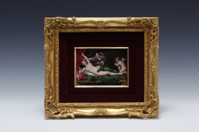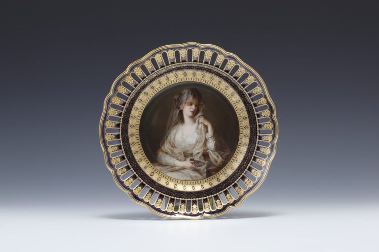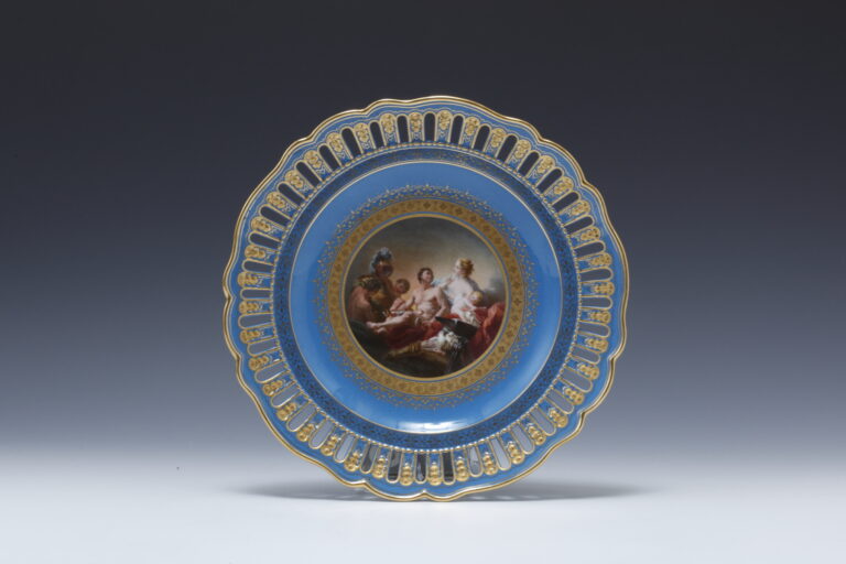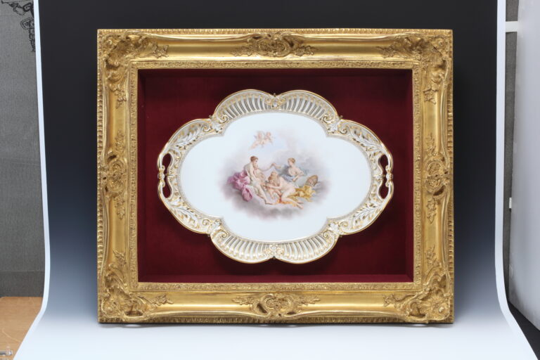 ルリ地金彩透かし彫りボーダー 名画図 飾皿額