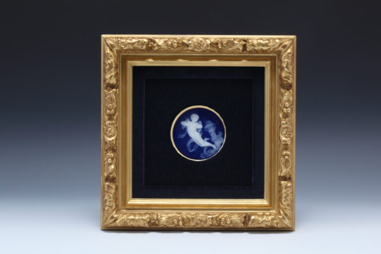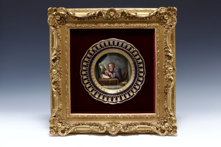 ルリ地金彩透かし彫りボーダー キャンドルの男性とマーブルバスト図飾皿額