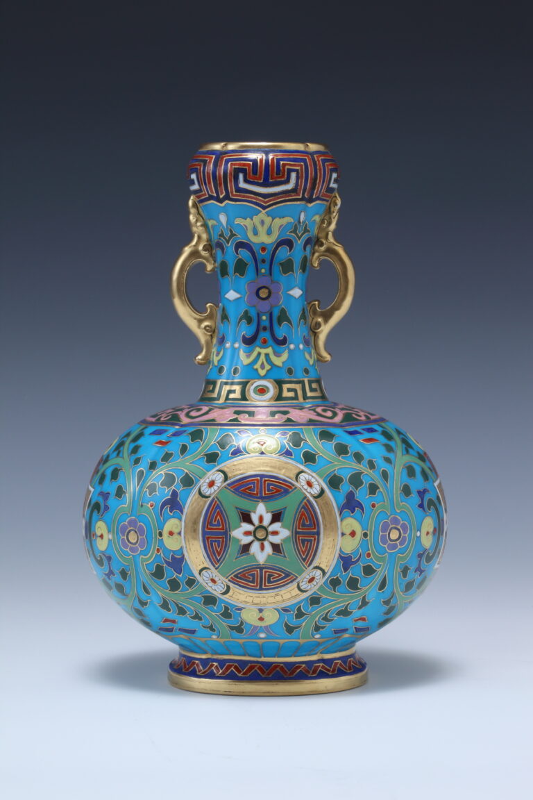 トルコ石ブルー地 エナメル唐草文に金のボーダーパネル両手鶴首花瓶