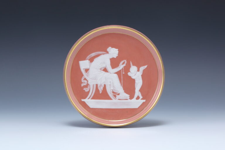 サーモンピンク地 パツィオパット円形陶板「首輪の女神と天使」
