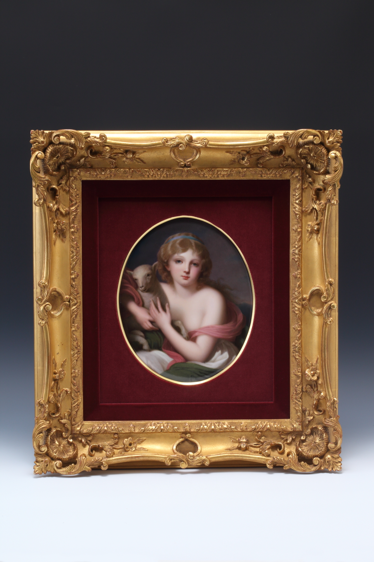 2人のギリシャコスチユームの女性と天使の楕円 陶板