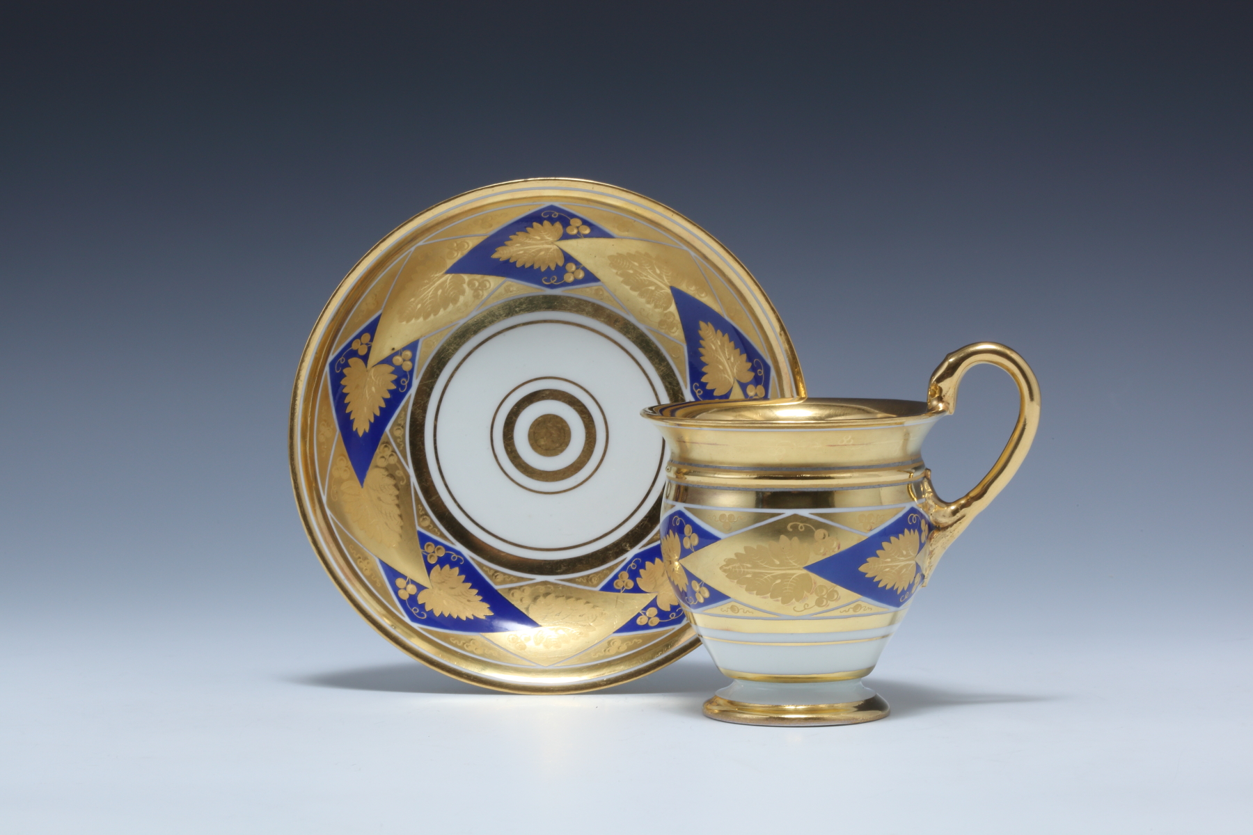 金とブルー地ヴァインリーフ文ハイループカップ&ソーサー