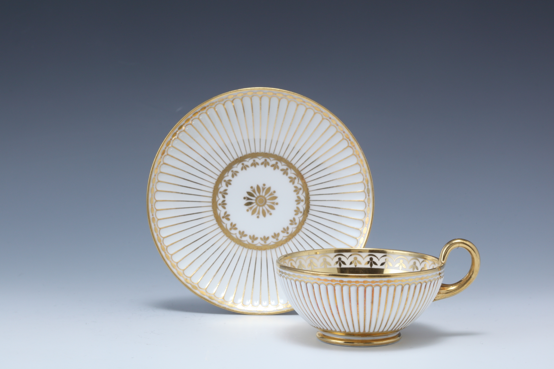 ブルーヌーボー地 金彩パルメットとマーガレット文 カップ&ソーサー
