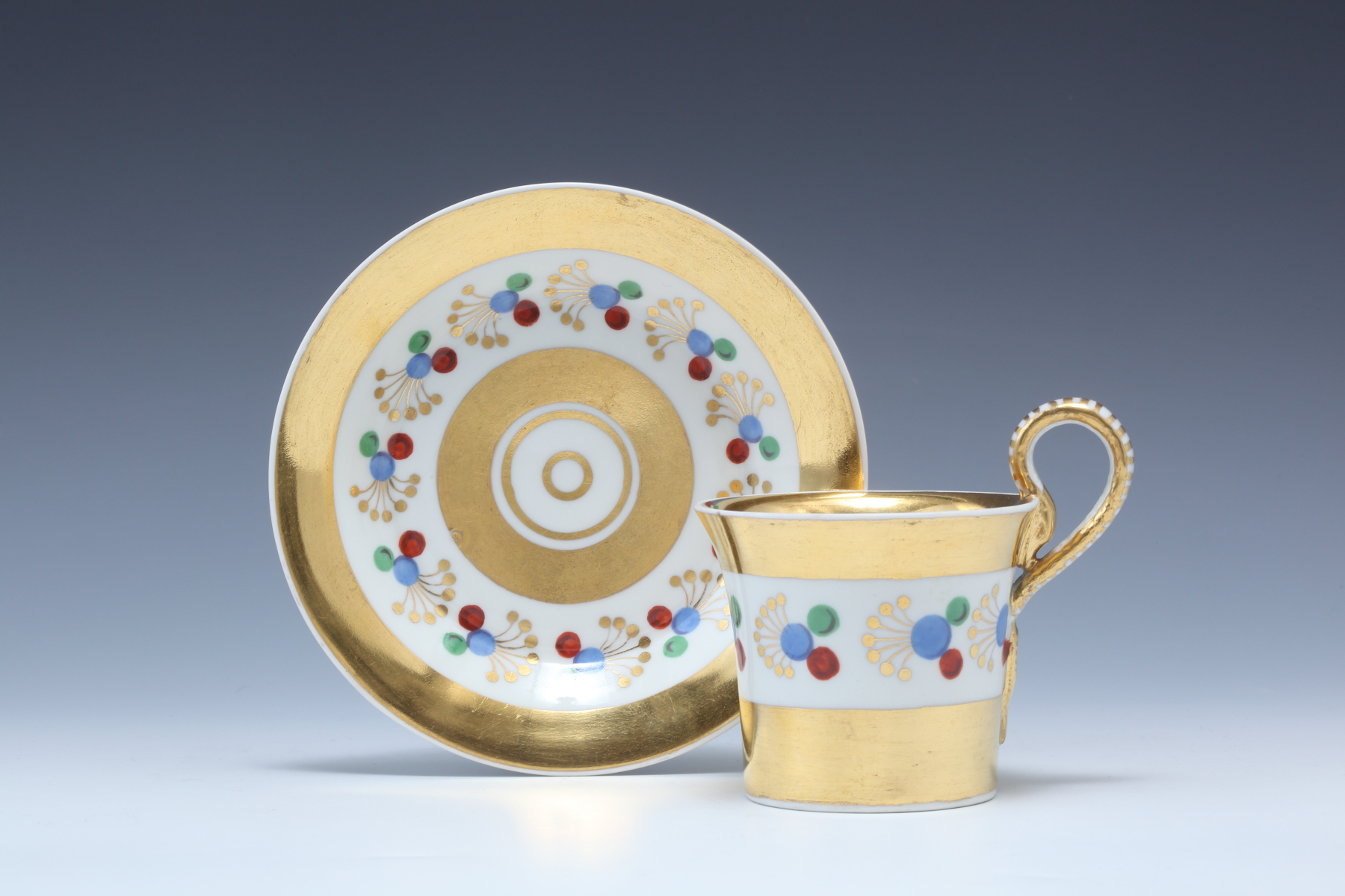 金とブルー地ヴァインリーフ文ハイループカップ&ソーサー