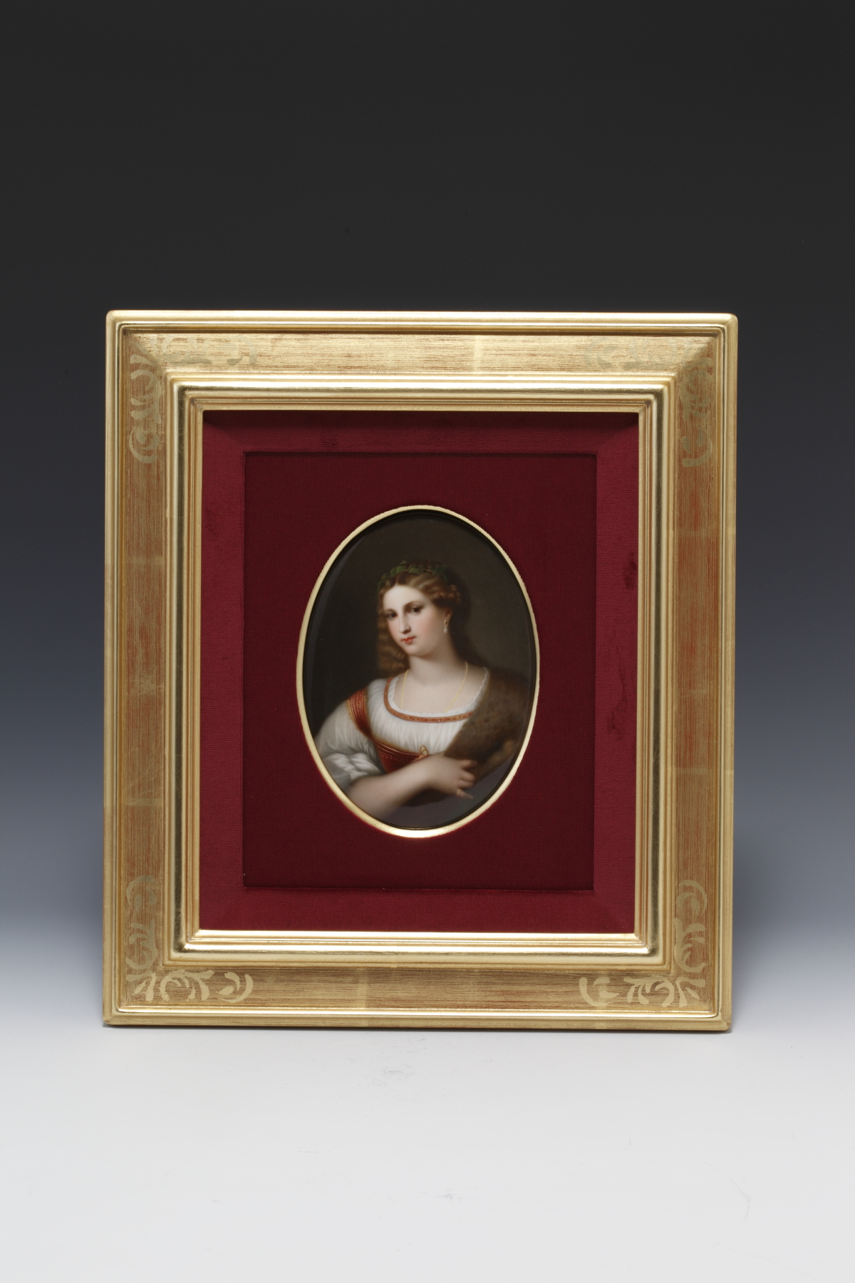 ルリ地金彩透かし彫りボーダー キャンドルの男性とマーブルバスト図飾皿額