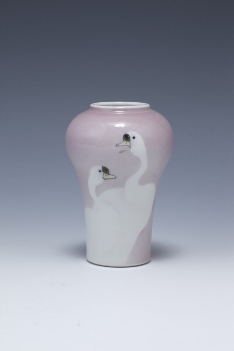 ピンク地 二羽のガチョウ図 小花瓶