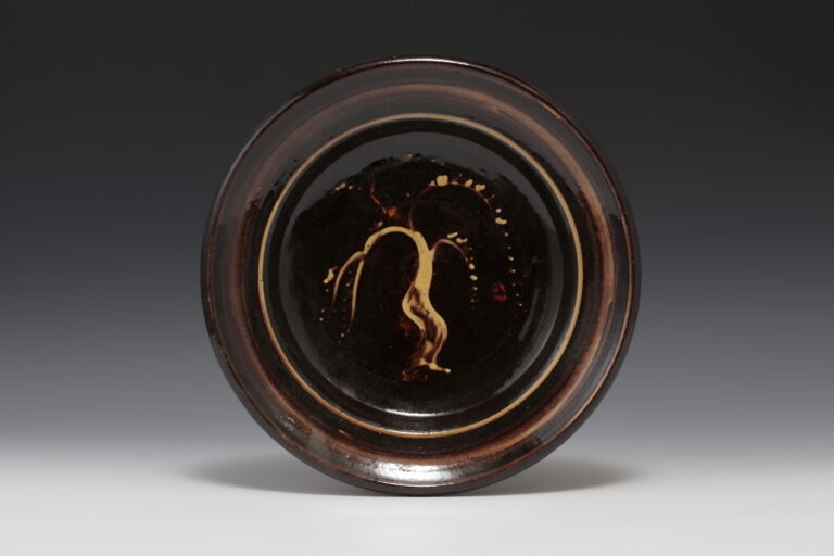 茶色地クリーム色のスリップ ウィロー文ディッシュ